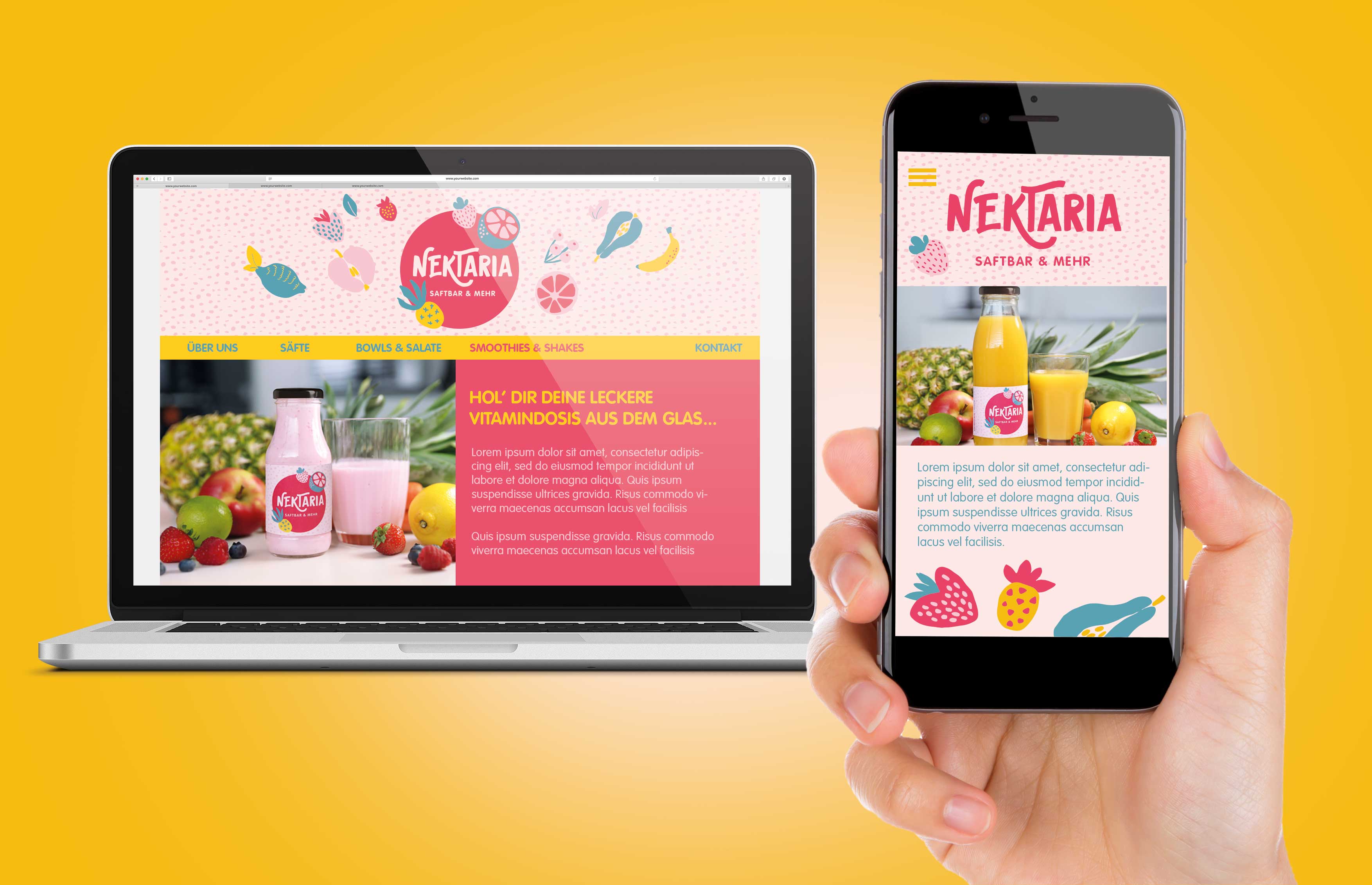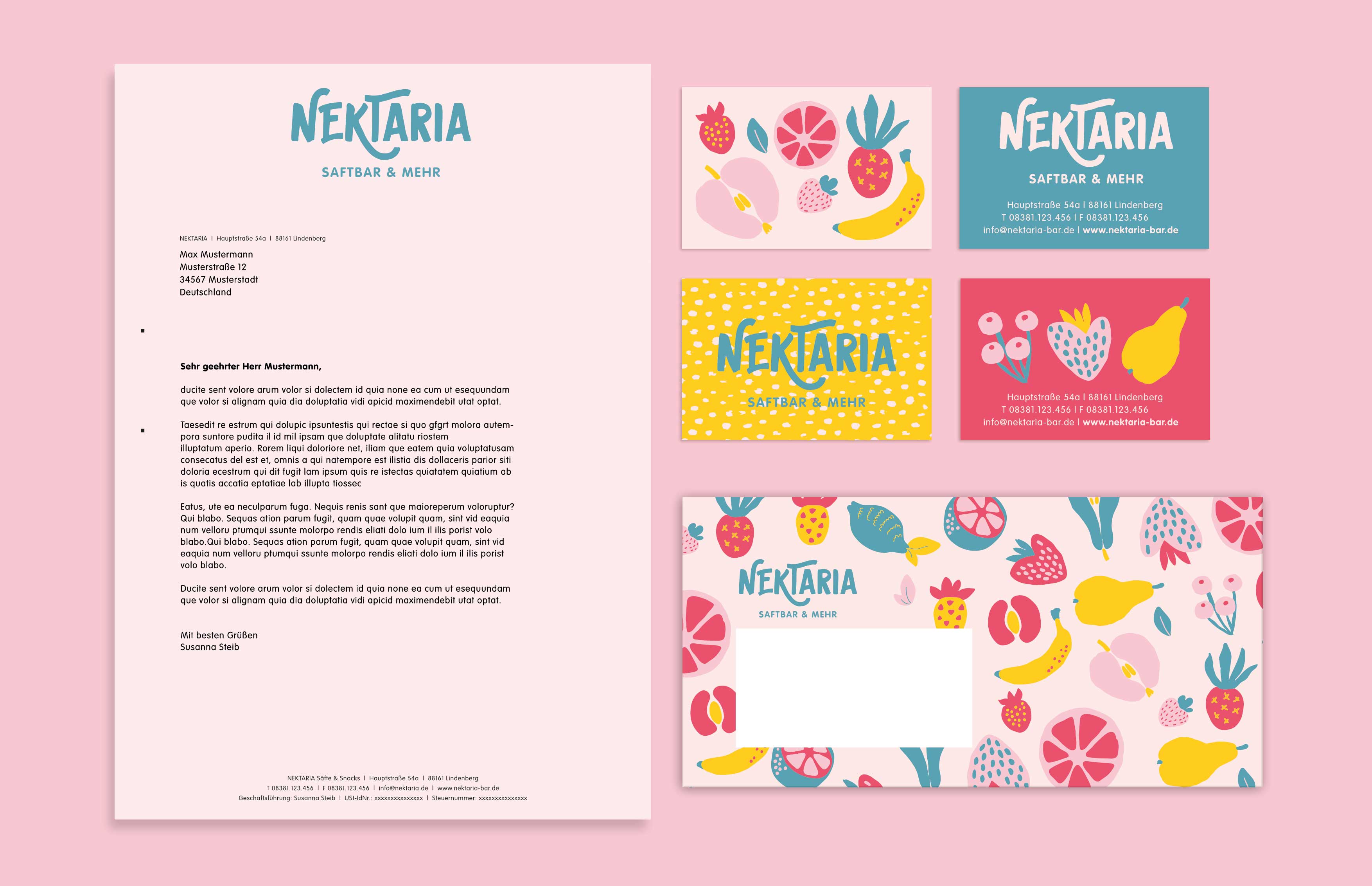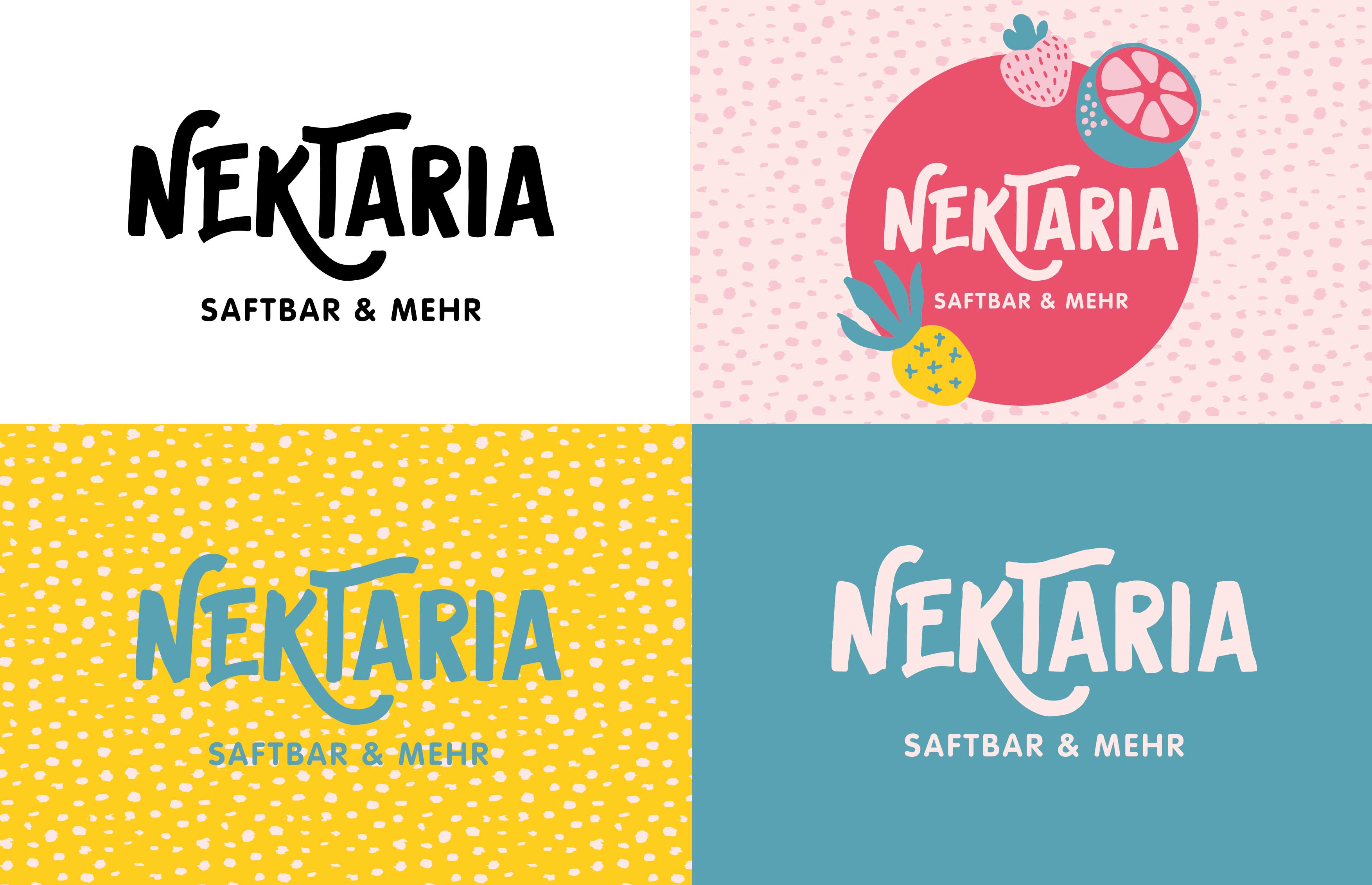 Wir wurden von der Inhaberin damit beauftragt, den gesamten Markenauftritt für die neue Saftbar in Lindenberg zu gestalten. Der Name ist eine Wortneuschöpfung aus "Nektar" und der Endung "-ria" (wie z.B. in Pizzeria oder Osteria). Dadurch wird eine positive Assoziation zu der Saftbar und ihrem Angebot hergestellt. Der Name prägt sich einfach ein. Das Logo ist verspielt-fröhlich und besitzt durch seine schwungvolle Schrift ebenfalls eine hohe Wiedererkennbarkeit. Die Markenfarben können flexibel eingesetzt werden. Der gesamte Auftritt wirkt dadurch keinesfalls streng, sondern fließend. Das verspielte Design mit den illustrierten, farbigen Früchten passt zum femininen Naming und zieht die Aufmerksamkeit auf sich. Die Früchte lassen sich in unterschiedlichen Farbkombinationen abwechslungsreich in allen Medien einsetzen und beliebig erweitern.